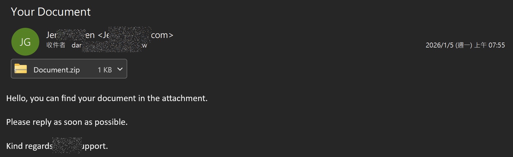 攻擊者會寄送名為 Document.zip 的壓縮檔,內部夾帶偽裝成文件的 Document.doc.lnk,利用使用者雙擊解壓縮檔案的習慣觸發攻擊。