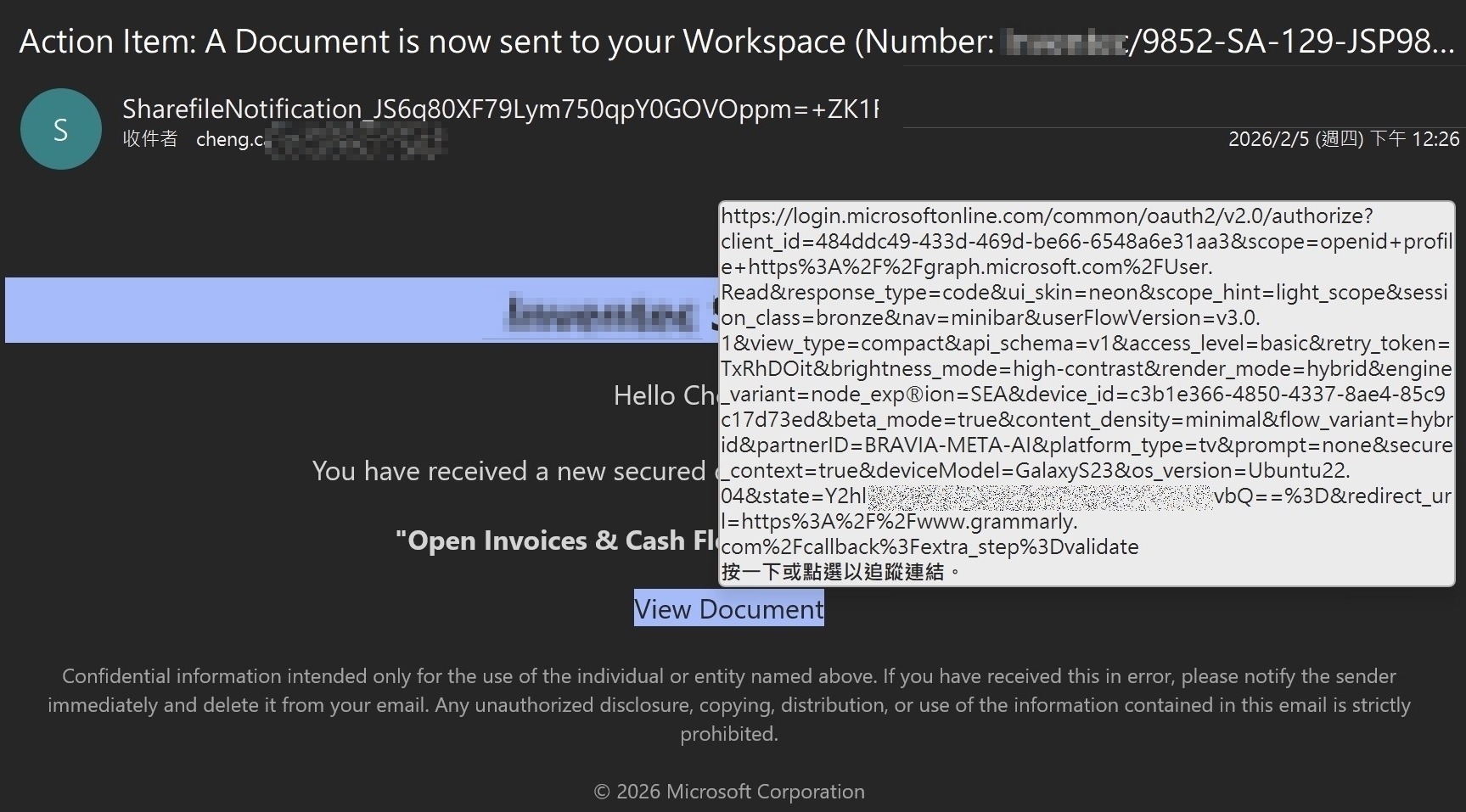 在本季截獲的樣本中,攻擊者透過發送看似正常的郵件,內含指向微軟官方登入網域的合法連結:
