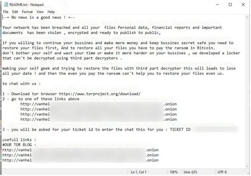 圖1 VanHelsing勒索軟體所投放的勒索訊息。