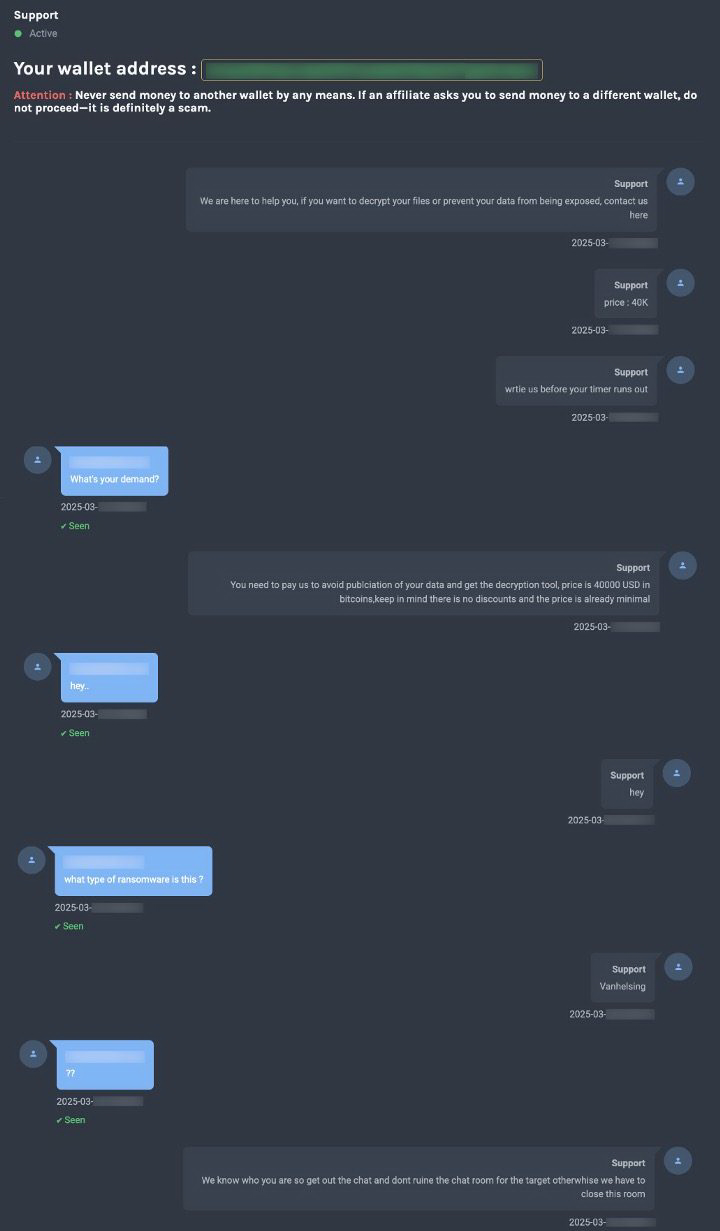 VanHelsing勒索軟體首個樣本於2025年3月中旬出現在公開的文件掃描網站上。與其他勒索軟體攻擊相似,VanHelsing會透過投放勒索訊息來要求解密檔案的贖金。目前尚無法確認VanHelsing勒索軟體威脅行動者所使用的感染途徑,不過推測其感染手法與其他勒索軟體組織相似,不會有太大的差異。