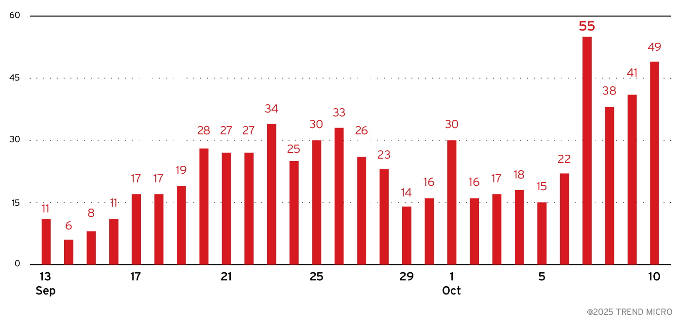 圖2 第2版推出之後Vidar的活動大幅增加(根據2025年9月至10月10日的監控資料)。