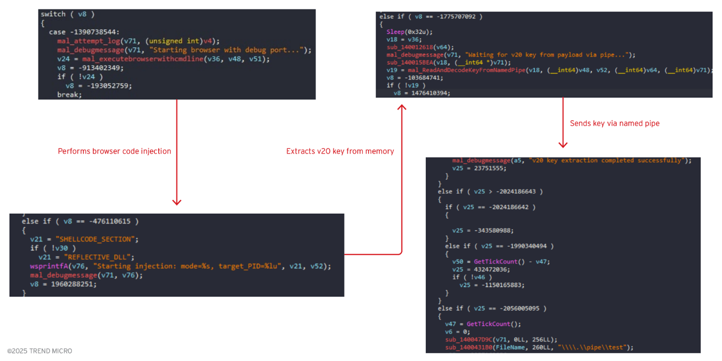 此外,惡意程式還會利用一種進階技巧,在啟用除錯功能的情況下啟動瀏覽器,然後透過shellcode或反射式DLL注入(Reflective DLL Injection)將惡意程式碼直接注入執行中的瀏覽器處理程序。被注入的惡意程式碼會直接從瀏覽器的記憶體內擷取加密金鑰,然後經由具名管道(Named Pipe)將竊取到的金鑰傳回惡意程式的主要處理程序,以避免在硬碟上留下痕跡(圖5)。這樣的作法可避開Chrome的AppBound加密保護,從使用中的記憶體內竊取金鑰,而非試圖從儲存設備解開金鑰。