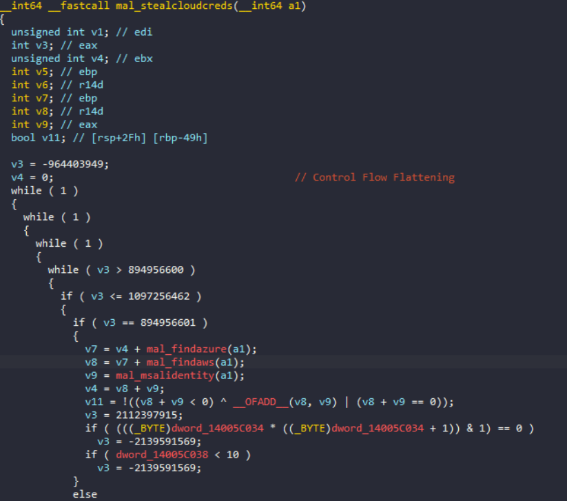 根據二進位檔案的分析顯示,新版的Vidar大量採用控制流程扁平化(Control Flow Flattening)技巧(圖6),藉由複雜的switch-case分支結構,然後再搭配數字狀態機器(Numeric State Machine),讓逆向工程變得更加困難。這種混淆技巧可將原本自然的程式流程轉換成一系列由switch敘述所控制的狀態轉換,進而掩蓋程式原本的邏輯。同樣的控制流程扁平化技巧也曾出現在Lumma Stealer的樣本當中,這意味著資訊竊取程式生態系內部似乎都採用類似的混淆框架。