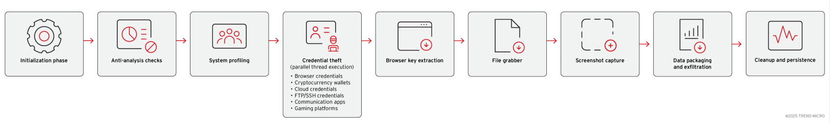 這樣的作法可讓惡意程式從多重來源(瀏覽器、虛擬加密貨幣錢包、檔案)同步竊取資料,而一次只能處理一種。平行處理可大幅縮短惡意程式在系統上維持活躍的時間,讓資安軟體更難加以偵測和阻止其資料竊取作業。