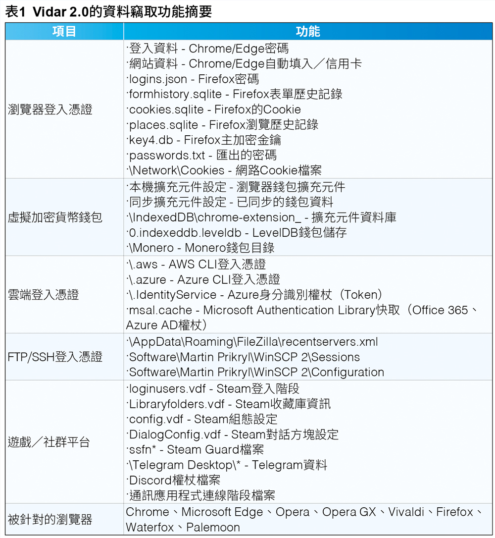 在成功躲避偵測之後,惡意程式會對系統進行徹底的分析來蒐集受害者的資訊,接著再針對不同的資料種類啟動平行的登入憑證竊取作業。其精密的瀏覽器登入憑證擷取手法,結合了標準的DPAPI解密與進階記憶體注入技巧,可避開Chrome的v20 AppBound加密,同時還能針對虛擬加密貨幣錢包、雲端登入憑證、通訊應用程式以及遊戲平台。檔案擷取元件會有系統地搜尋使用者目錄與隨身碟上的珍貴檔案,尤其是虛擬加密貨幣金鑰和可能的登入憑證檔案,如表1所示。