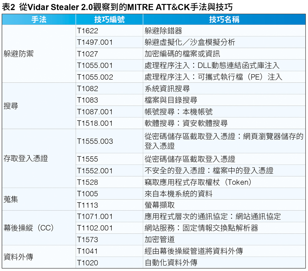 此外,從Vidar Stealer 2.0觀察到的MITRE ATT&CK手法與技巧,可參考表2的說明。