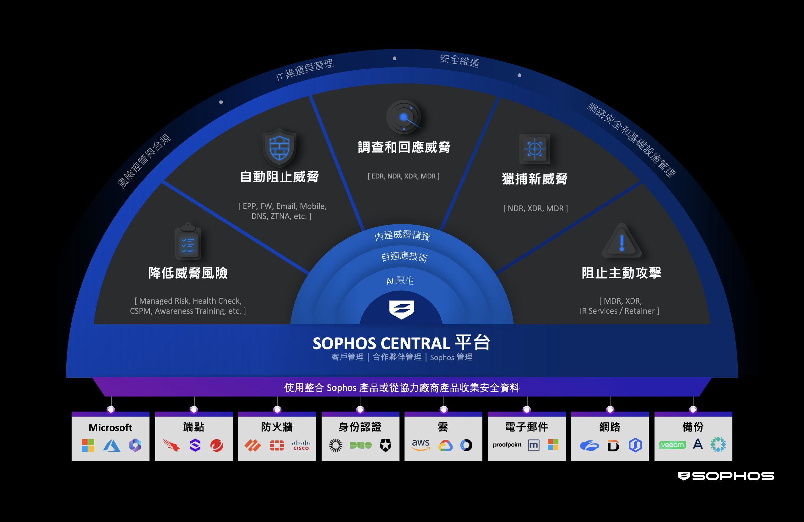 Sophos Central平台整合端點、身分、網路與雲端資料,結合預防優先策略與XDR架構,實現風險前移、主動防禦與威脅快速遏止。
